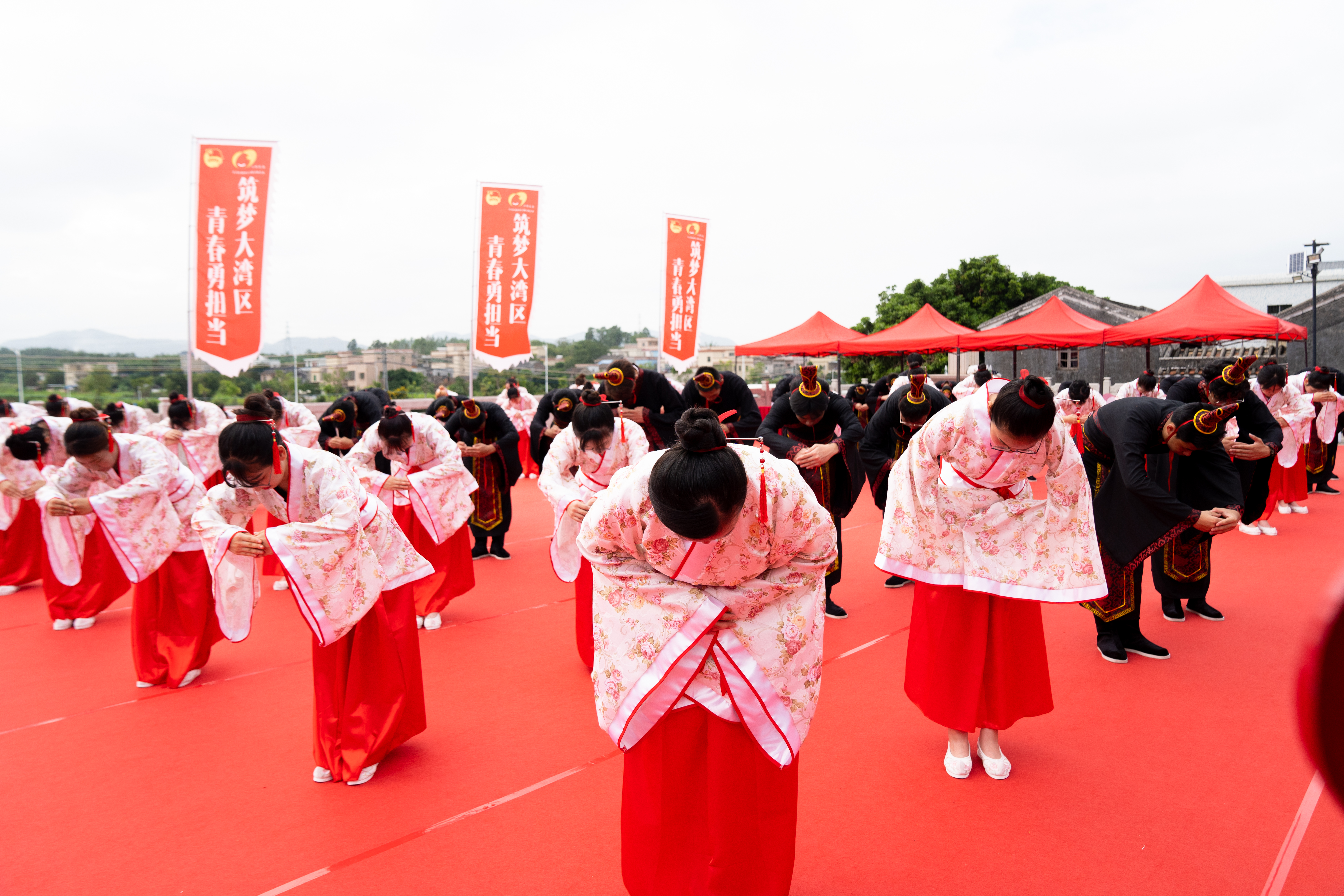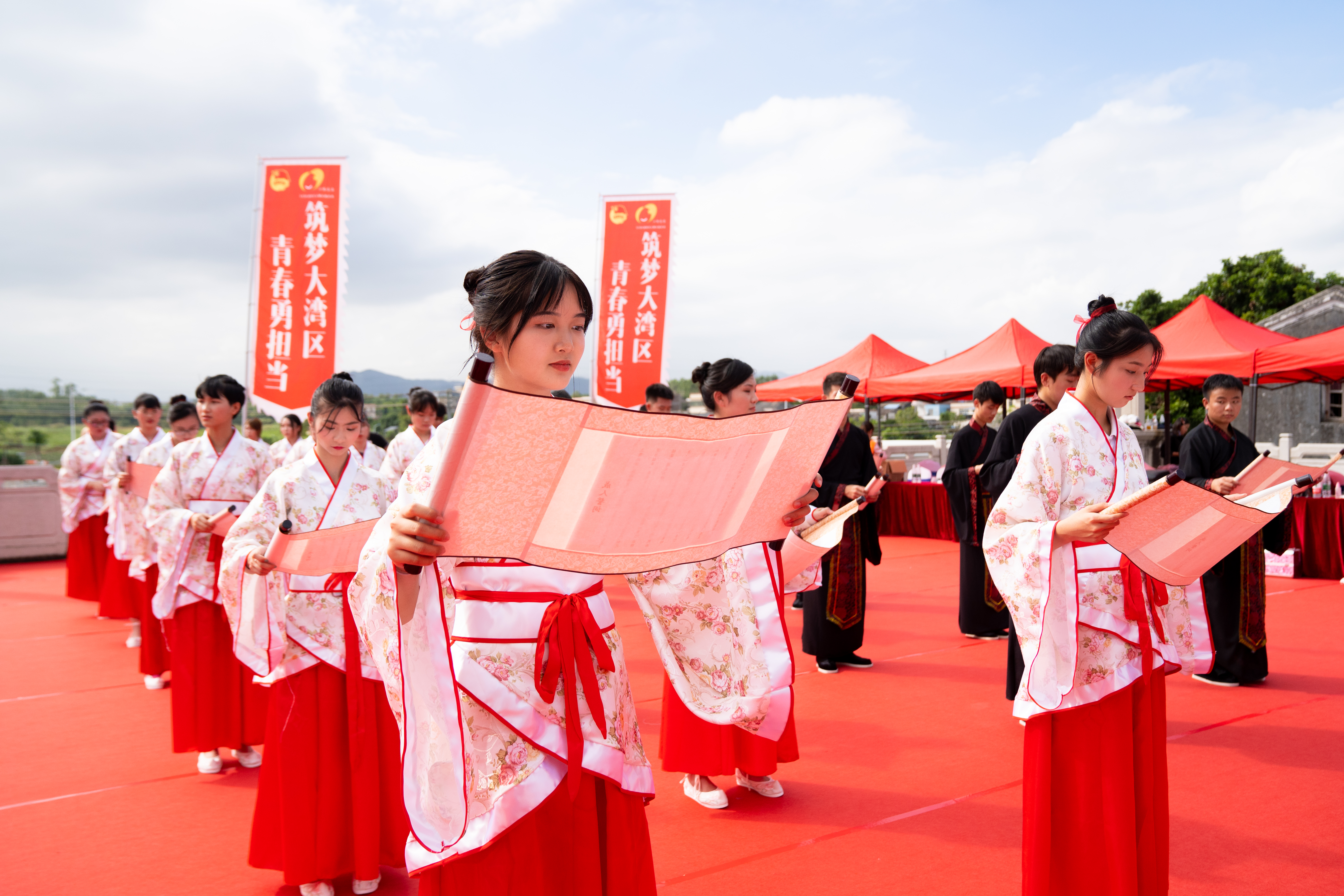 “上苍庇佑,地母哺育。龙之传人,天命东方。生如夏花,莞尔韶华,奕奕容光。”由珠海校区人文学院2020级法学专业柯昊文(中国澳门)同学带领三地青年宣读誓词。加冠加笄、三拜、置醴、真情感言、宣誓……港珠澳三地青年身穿汉服,跟随着赞礼的指引,走到师长面前,接受冠礼、笄礼并宣读成人誓词。