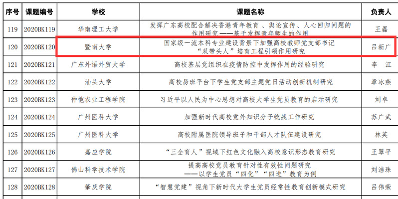 近日,广东省高等学校党的建设研究会公布了2020年省高校党建研究课题立项结果,我校8个课题获立项,立项数位居全省高校首位。其中,包装工程学院吕新广教授的课题《国家级一流本科专业建设背景下加强高校教师党支部书记“双带头人”培育工程引领作用研究》(编号:2020BK120)是我校获批8个项目之一。