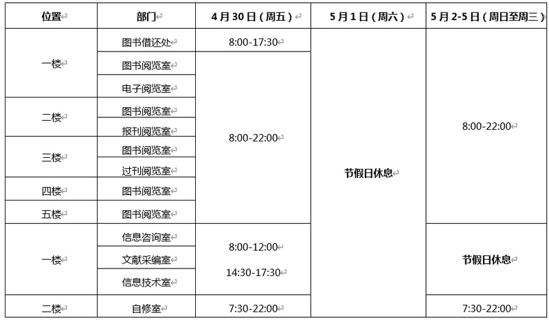 图书馆2021年“五一“期间服务时间安排 发布时间:2021-04-27|发布单位:珠海校区官网 各位读者:根据学校关于2021年“五一“节放假的通知要求,珠海校区图书馆五一期间开放安排如下: 珠海校区图书馆 2021年4月26日