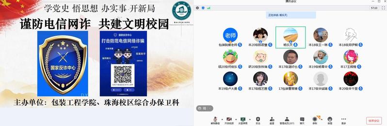 为深入贯彻落实学校党委、校区党工委关于开展党史学习教育的工作方案要求,将党史学习和解决学生实际问题相结合,进一步提升学生的防骗反诈意识,6月2日晚,包装工程学院和校区综合办保卫科联合举办了“我为群众办实事、争做贡献暖暨南”系列活动——“谨防电信网诈、共建文明校园”主题宣传教育活动。包装工程学院书记吕新广、综合办保卫科负责人、学院全体研究生、本科生200余人参加了会议。