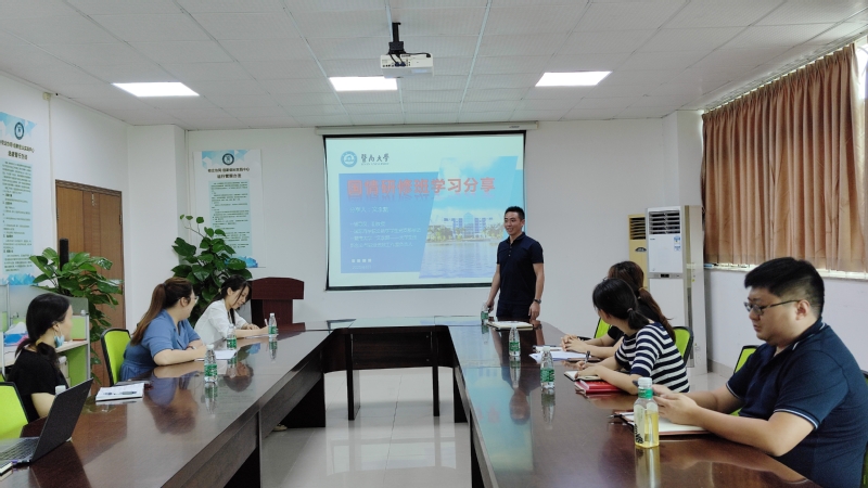随后,文李黠副教授进行中央社会主义学院国情研修班学习成果的分享,并结合工作经验从学、思、感、悟四个方面与各位老师开展交流。文李黠,指出要高度重视港澳台侨学生工作,团结各地区学生,同时他强调团队成员之间要相互完善和相互进步,才能在工作中不断力争上游,寻求突破。