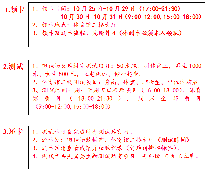 4.测试者需携带身份证(必带)、学生证、校园卡(学生证校园卡两者选带其一),以便核实身份及测试时使用,不提供相关证件的测试者一律不能测试。