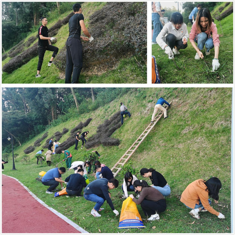 随后,支部成员参加了“忠信笃敬”校训景观美化活动,大家前往日月湖畔的校训绿植景观开展义务拔草志愿服务,以实际行动表达爱校之情。丹田物业提前准备了手套、编织袋、小锄头等劳动工具,并安排了绿植景观补苗事宜,师生党员干劲十足,或徒手拔草、或用小锄头挖,或来回运送,经过一个多小时的奋战,将杂草清理干净,“忠信笃敬”校训景观焕发新颜,静待学校115周年校庆的到来。