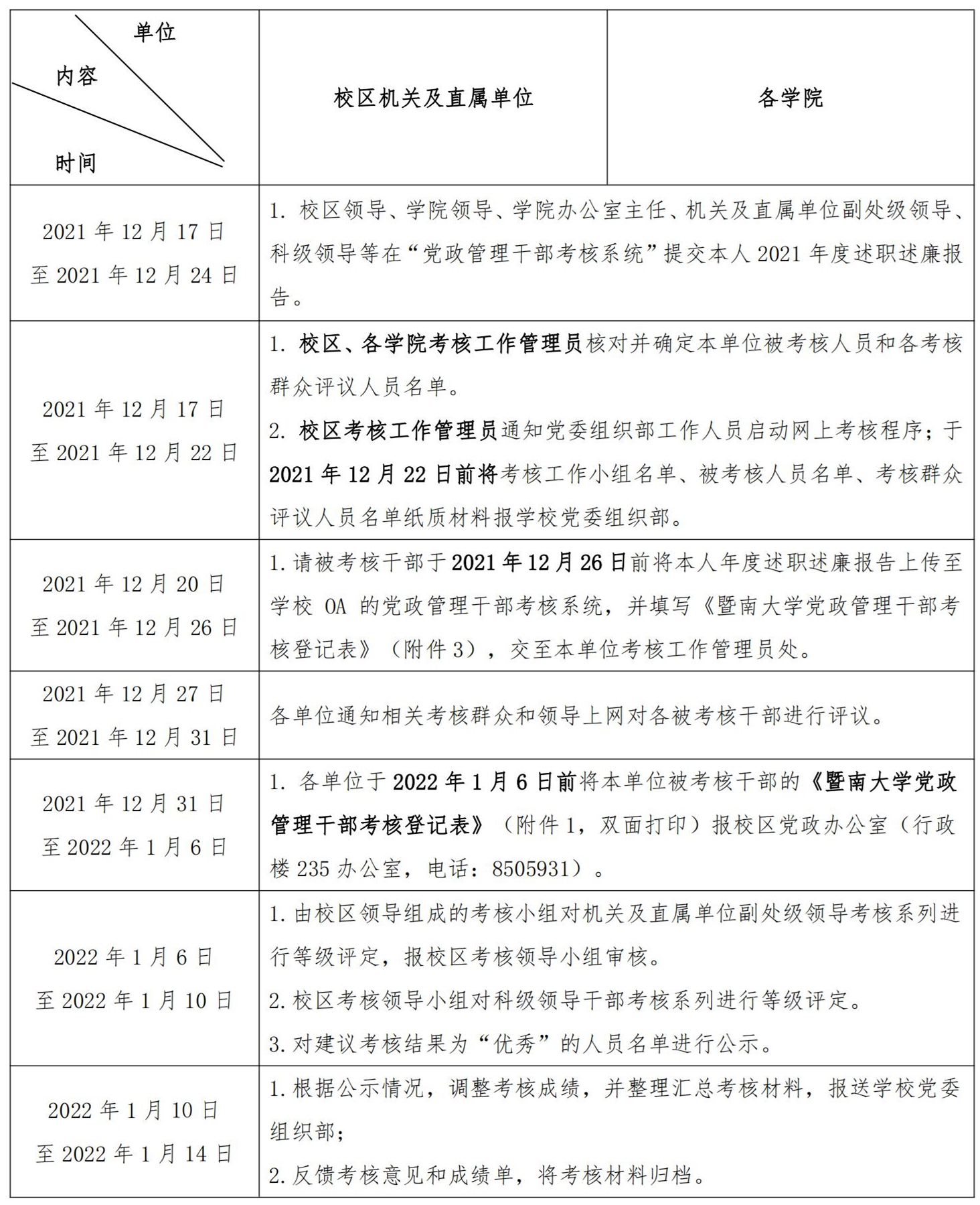 按照《中共暨南大学委员会关于印发<暨南大学党政管理干部考核工作规定>的通知》(暨党发〔2021〕36 号)、《中共暨南大学委员会关于做好2021年度党政管理干部考核工作的通知》(暨党通〔2021〕52号)通知精神,现将校区党政管理干部考核工作安排如下: