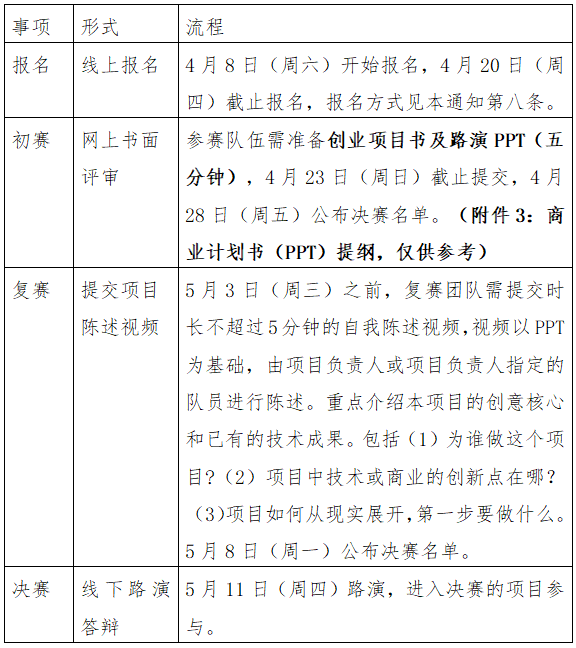 (二)同期活动。包括启动仪式、竞赛配套讲座、创业沙龙系列活动之项目打磨会、优秀项目展、颁奖仪式等。