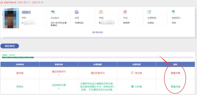 1.毕业生自行登录离校系统,查看学杂费缴费情况。
