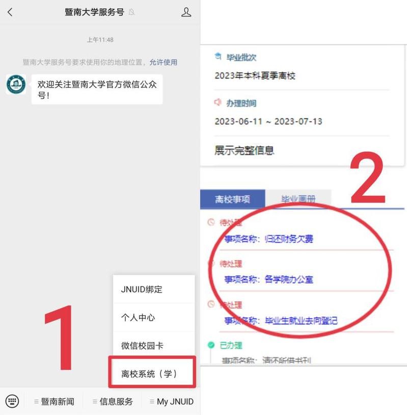 访问入口二:暨南大学官方微信服务号(微信号:JinanUniversity)底部菜单栏“My JNUID”→点击“离校系统(学)”(https://lixiaostu.jnu.edu.cn),查看毕业生离校手续事项。