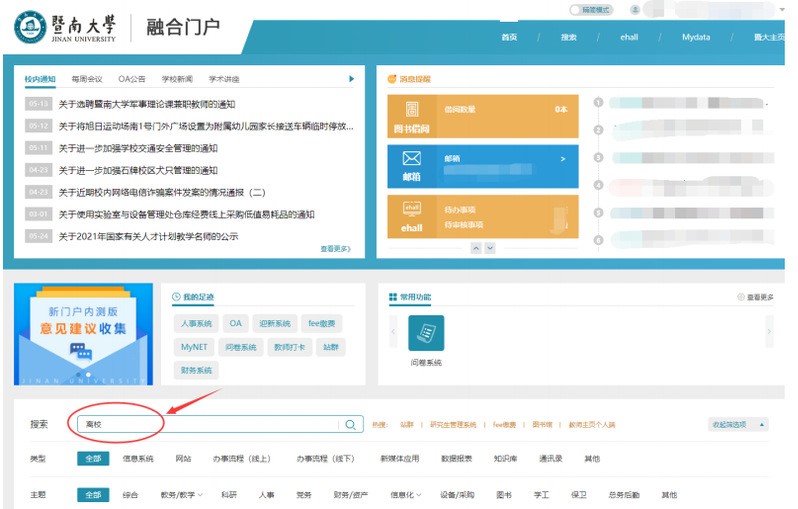 访问入口一:登录学校融合门户(https://info.jnu.edu.cn)→搜索“离校系统(https://lixiaostu.jnu.edu.cn)”即可查询自己的离校手续办理情况。