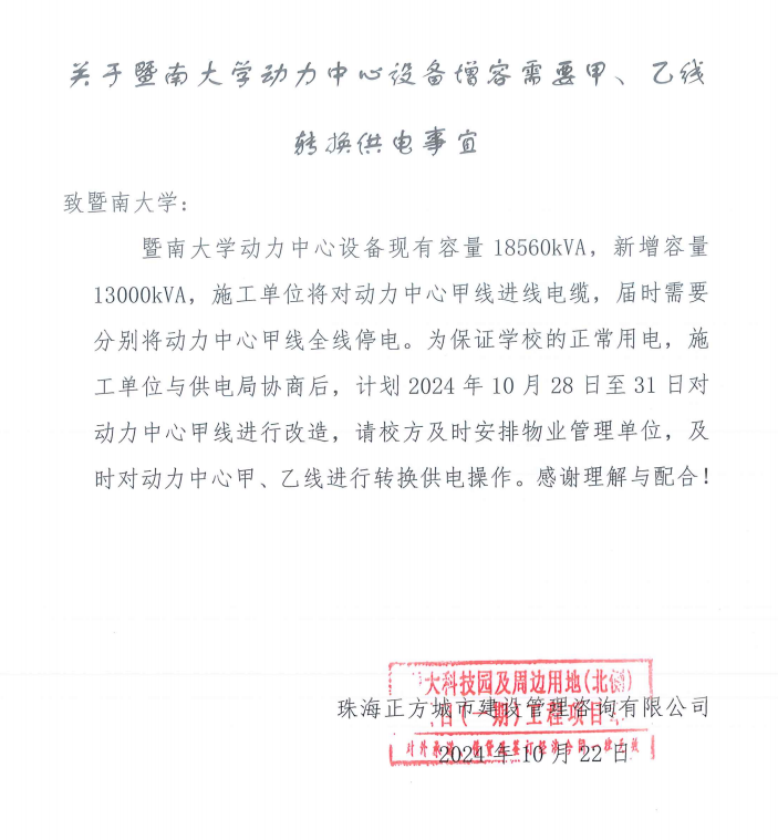 为配合暨南大学珠海校区动力中心高压供电设备新增容量13000kVA,现拟定于2024年10月27日(星期日)进行校区分区域停电作业。
