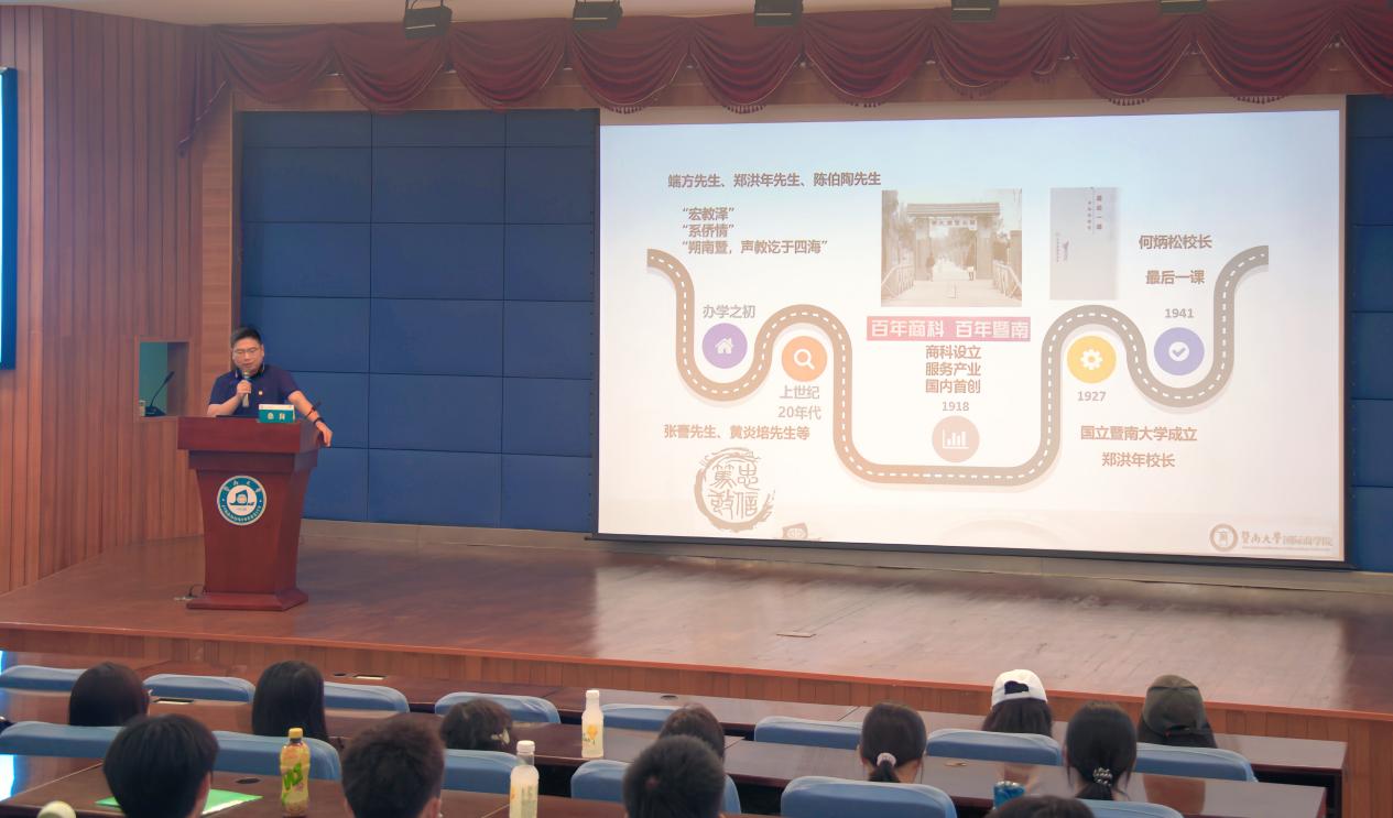 9月28日下午,国际商学院党总支书记徐岗以“暨遇国商 再启新程”为主题,为学院2025级全体本科新生讲授“思政第一课”。