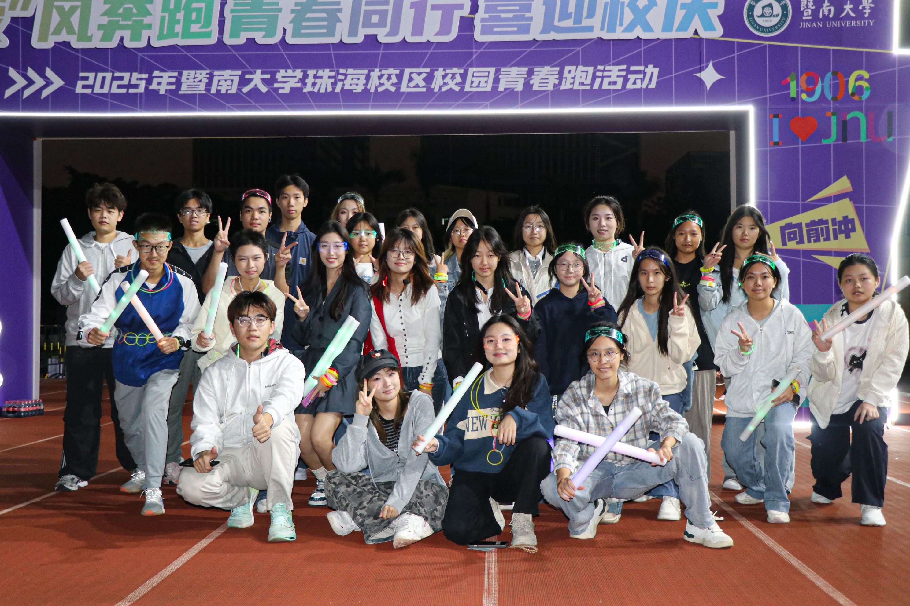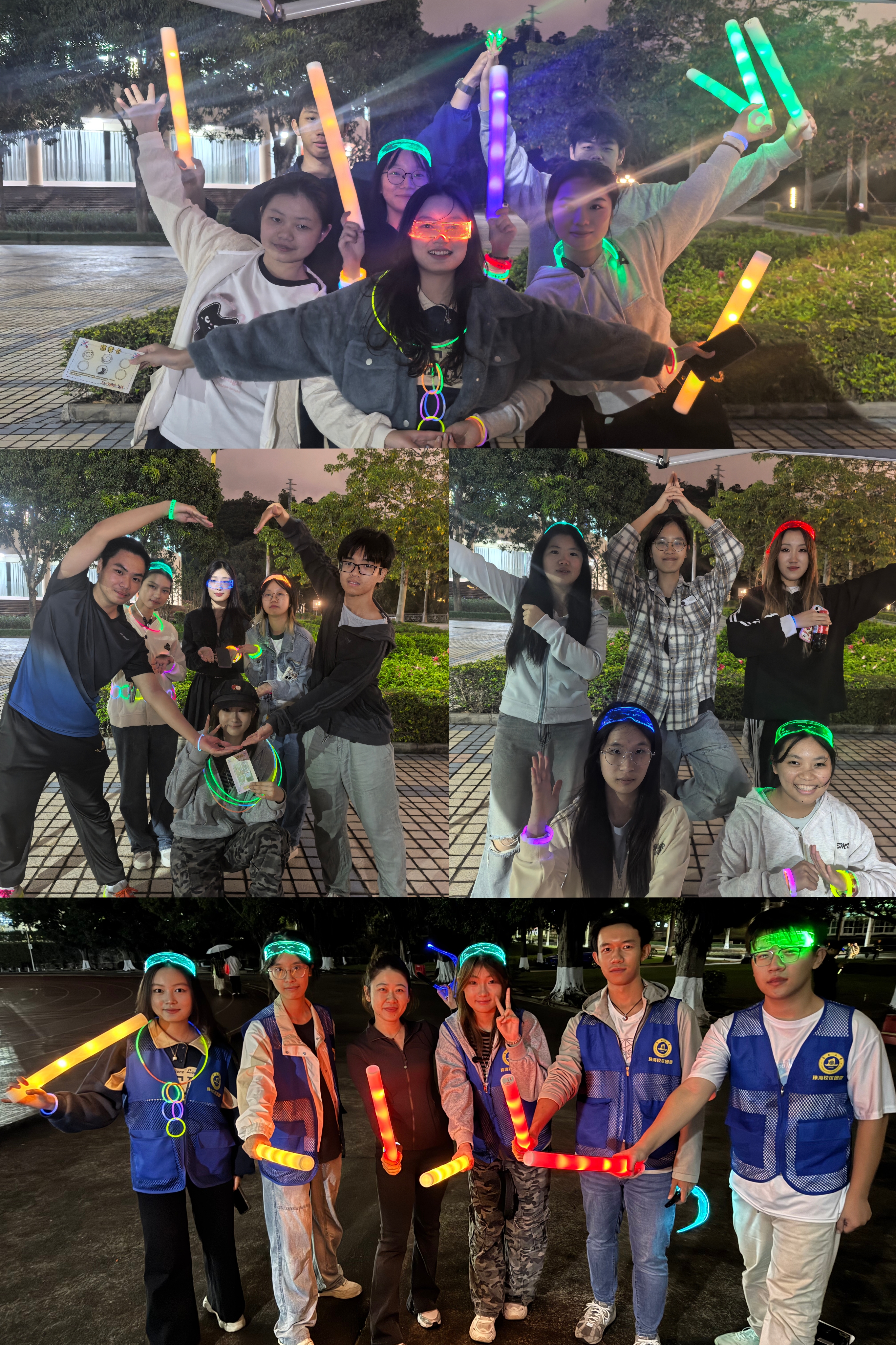开跑鸣笛声响起,800余名参赛师生冲破起跑线,正式开启比赛。个人竞速组沿指定路线环校跑,团队组到沿途设置的各个打卡点集章完成比赛,今年创新性开设了“校史知识大闯关”打卡点,同学们在游戏中学校史,增强对学校的归属感和认同感。棕榈树下光影斑驳,日月湖畔水波荡漾,红色跑道上足音铿锵,楼栋球场前欢声笑语,在簇簇荧光的见证下,选手们的青春活力燃遍整个校园。
