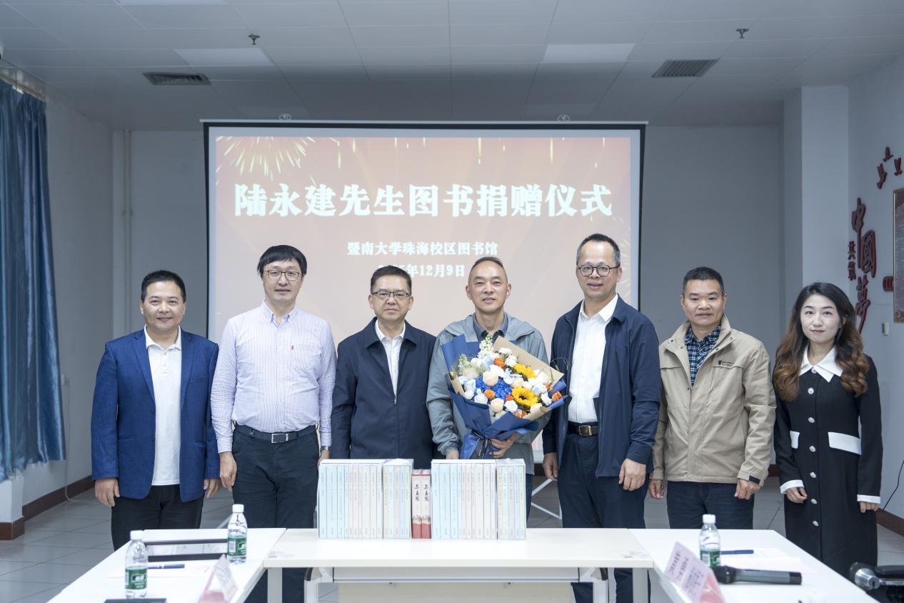 2025年12月9日下午,第七届福建省作家协会副主席,中国作协、书协、评协、摄协、视协会员陆永建先生著作捐赠仪式在暨南大学珠海校区图书馆先锋研修室举行。珠海市委常委、宣传部部长徐剑,海峡文艺出版社兼中篇小说选刊杂志社社长林滨,校区党委书记卢健民,人文学院党总支书记张宇明,校区图书馆馆长黄勇,以及师生代表共同出席活动。仪式由黄勇主持。仪式上,陆永建先生向校区图书馆捐赠了其个人著作长篇小说《聚春园》与《陆永建选本》(1-15卷)各两套,共计32册。卢健民代表校区接受捐赠,并向陆永建先生颁发了捐赠证书。