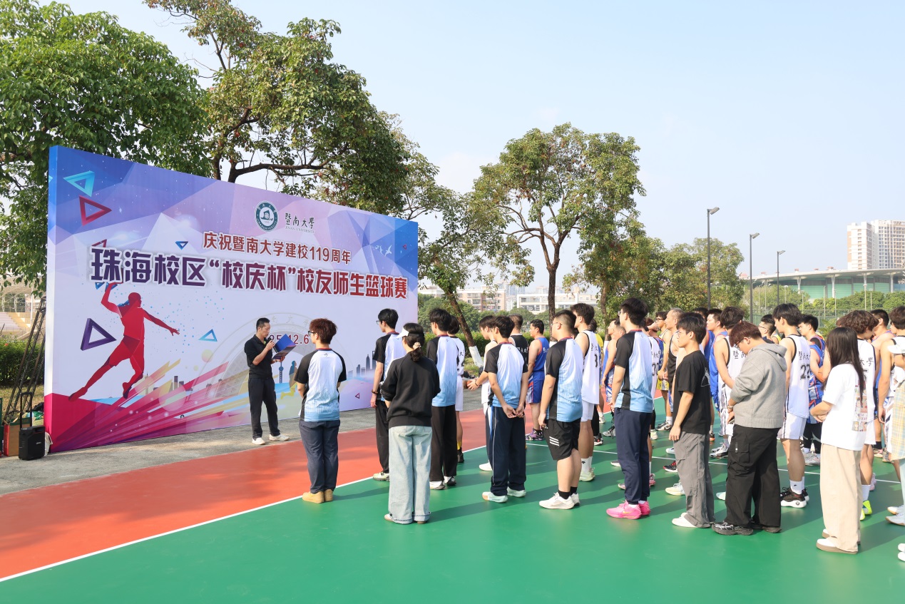 2025年12月6日下午,美丽的珠海风和日丽、阳光明媚,珠海校区篮球场洋溢着热烈的气氛。为庆祝暨南大学建校119周年,校区在此隆重举行“校庆杯”校友师生篮球赛。赛事于14:30正式拉开帷幕,历时两个半小时,于17:00圆满结束。