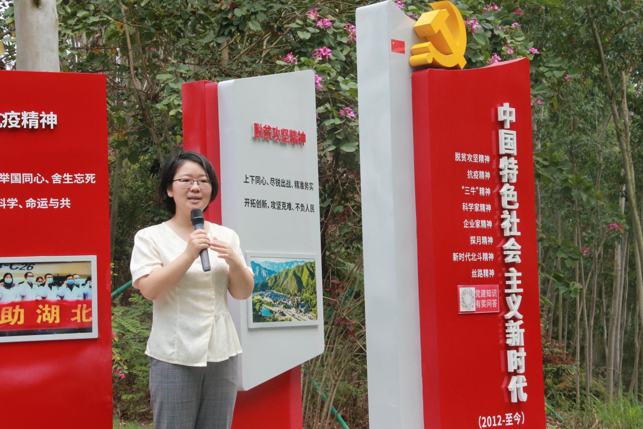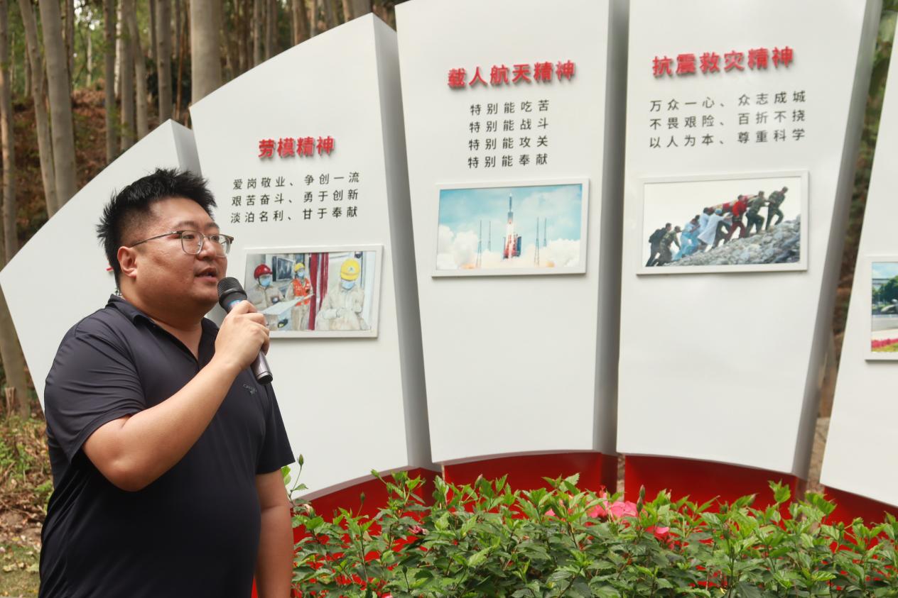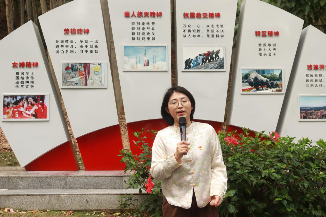 随后,全体人员前往红花山郊野公园开展实践学习。在中国共产党人精神谱系展板前,副书记卞旭、学生党支部书记吕映含、孟朗、尹港港讲授主题微党课。卞旭讲解了新民主主义革命时期形成的井冈山精神、长征精神、遵义会议精神、延安精神、抗战精神的内涵;孟朗结合特区精神鼓励同学们开拓进取,将个人发展融入特区建设之中;吕映含阐述了航天精神,希望同学们在科研中耐得住寂寞、坐得住冷板凳;尹港港围绕脱贫攻坚精神核心内涵,结合青年榜样事迹阐释革命精神的当代传承,引导青年学子践行青春担当。微课堂内容精炼、引发共鸣。