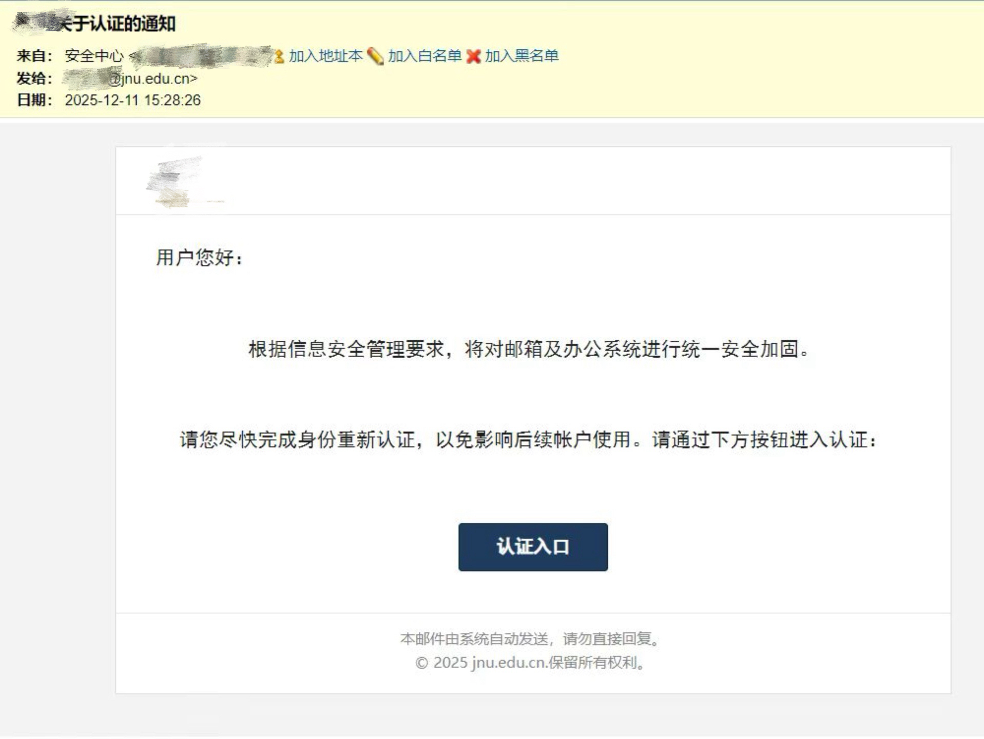 安全防范从我做起,钓鱼邮件甄别方法请参考:《网络安全温馨提示:警惕钓鱼邮件》(https://zh.jnu.edu.cn/2025/0106/c42461a829490/page.htm)。