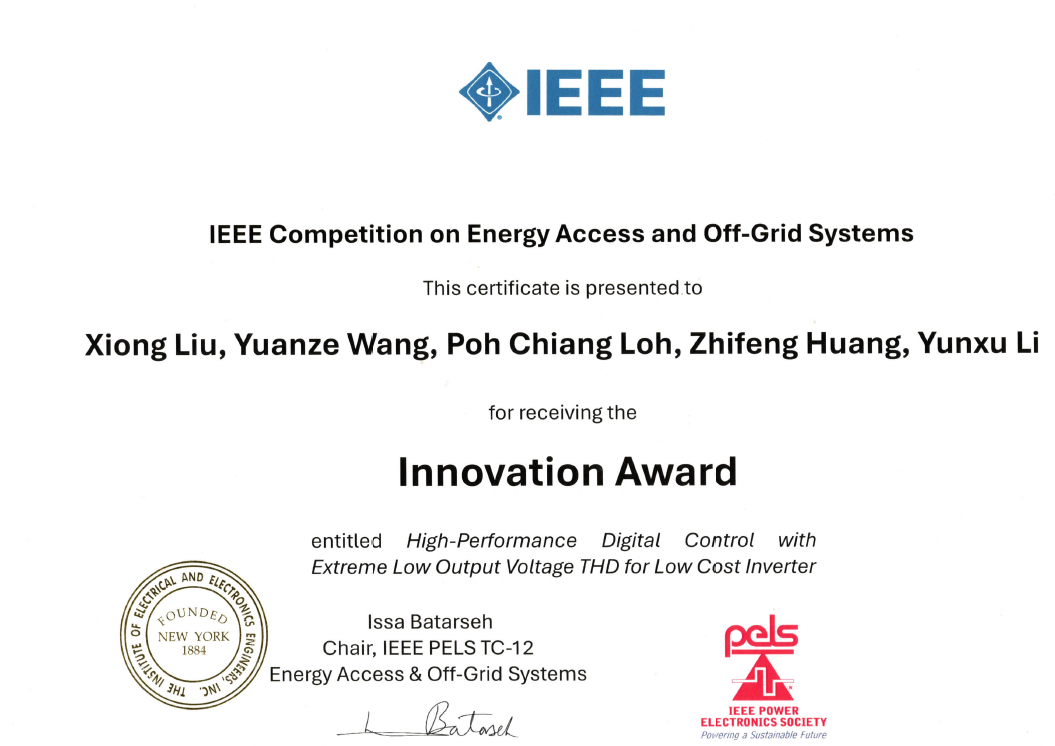 国际荣誉!国际能源学院/能源电力研究中心斩获IEEE电力电子学会国际赛事创新奖