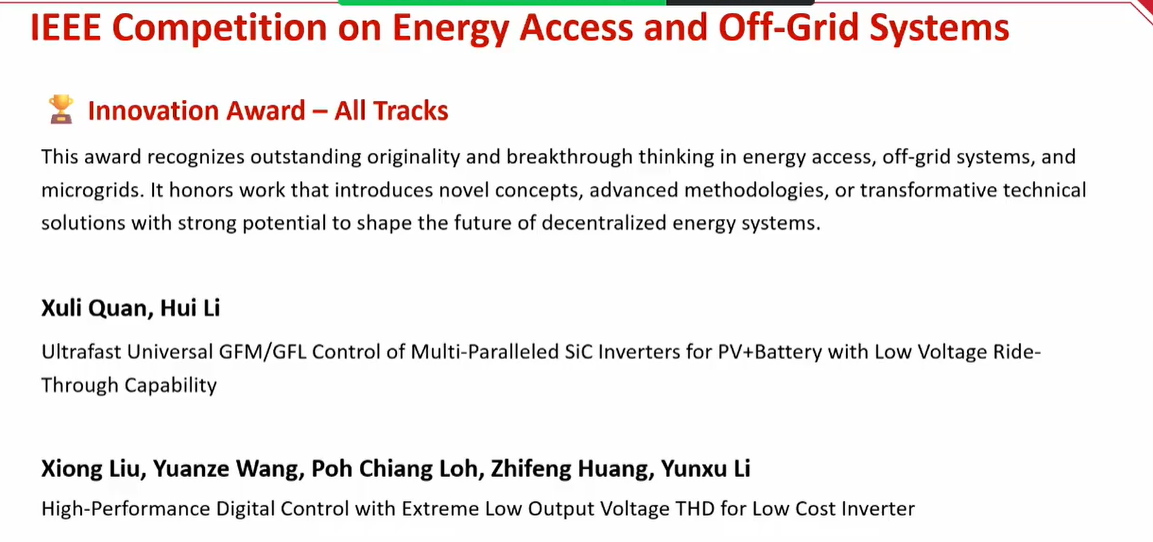 该赛事由 IEEE电力电子学会(IEEE PELS)Technical Committee 12 发起,聚焦能源可及性、离网系统、微电网等前沿方向,奖项设置涵盖创新、社会影响、硬件方案、控制与自动化等类别。本次比赛共有全球74支队伍参加,涵盖中国(多所知名高校)、美国(佛罗里达州立大学等)、英国、印度、加拿大(阿尔伯塔大学)、丹麦(奥尔堡大学)、瑞典(瑞典皇家理工学院)、荷兰、意大利、西班牙、韩国、新加坡(南洋理工大学)、澳大利亚等近20个国家。由暨南大学、深圳拓邦、香港中文大学组成的联合团队将研究聚焦于逆变器控制的核心技术,最终脱颖而出,获得“Innovation Award”(创新奖),并列获得该奖项的是美国佛罗里达州立大学Hui Li教授团队(IEEE Fellow)。该奖项于2026年3月24日在美国应用电力电子APEC国际会议上正式颁发。