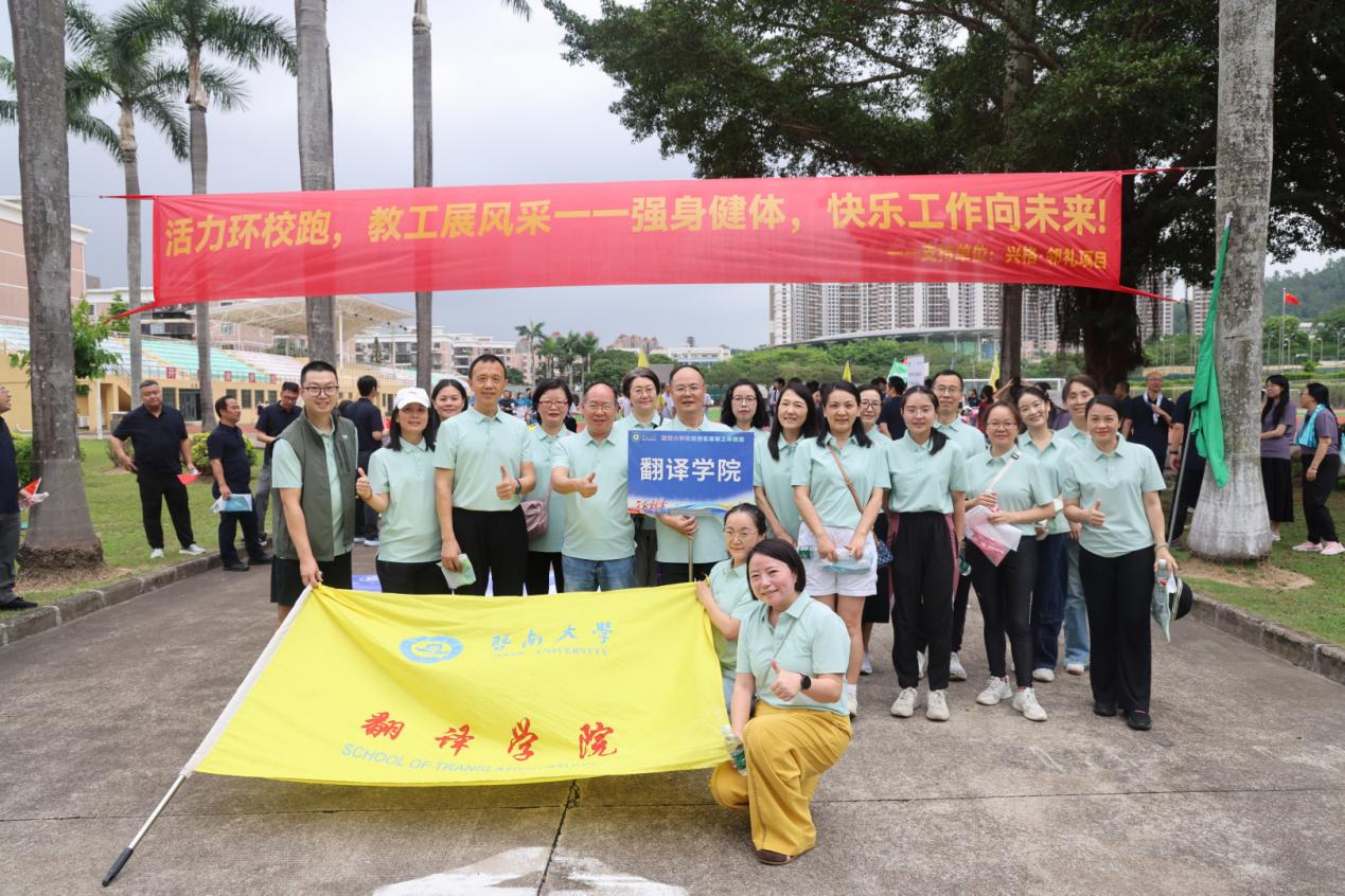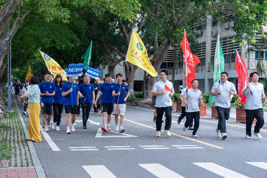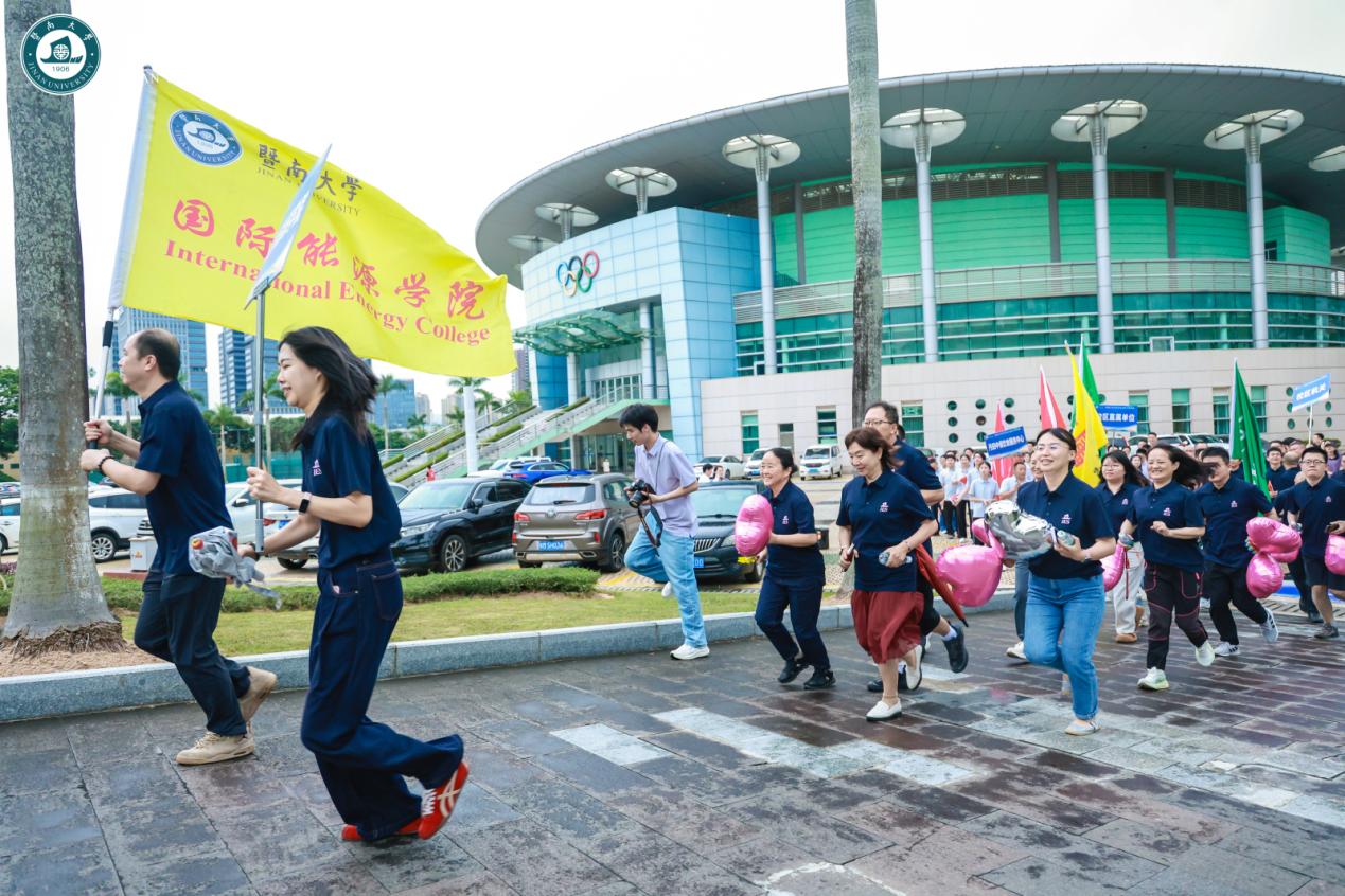 本次环校跑路线经过精心设计。各参赛队伍在院旗与单位标识牌的引领下,排成整齐的两列纵队,自体育馆出发,沿校区主干道一路向前,途经暨南大学科技园(珠海),最终直达终点田径运动场。沿途绿树成荫、春意正浓,教职工们步伐矫健、结伴而行,在一呼一吸间尽享春日校园的自然之美与运动的酣畅淋漓。队伍中欢声笑语不断,大家用脚步丈量美丽校园,绘就了一幅生机勃勃、奋发向上的校园健康新画卷。